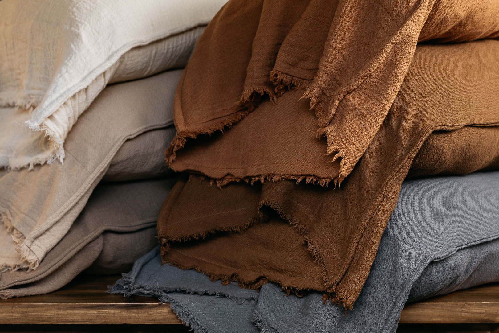 Almohadón de trama de algodón, con una solapa desflecada que cae a un lado.