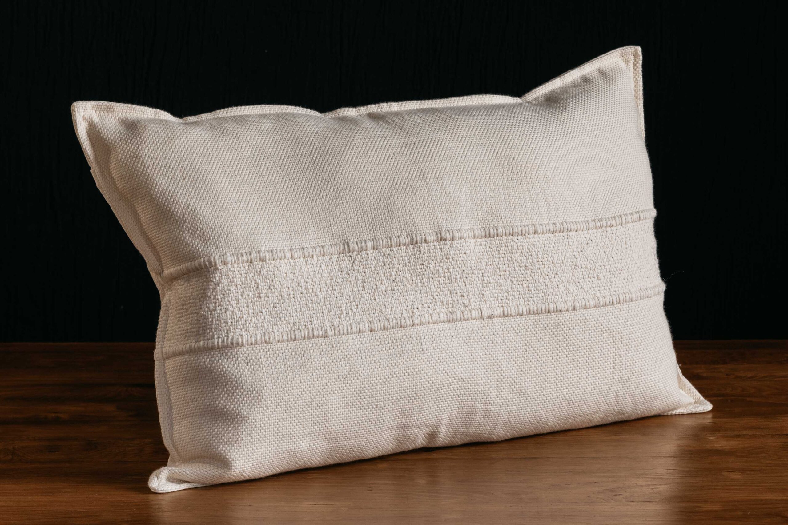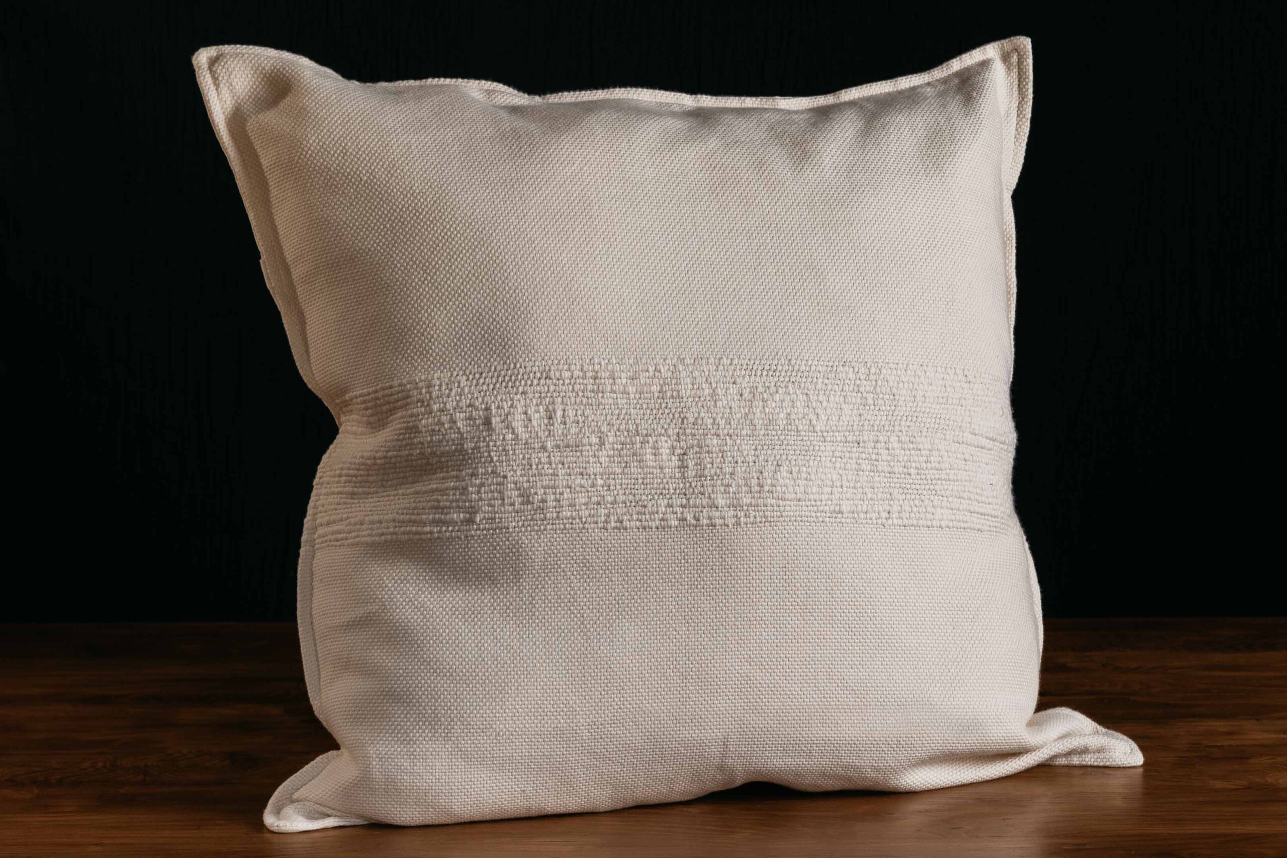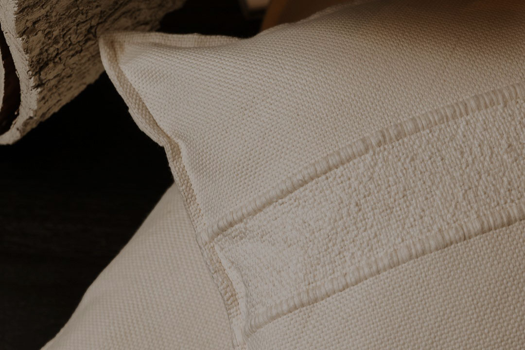 Almohadón de Hilo de Algodón tejido en telar, con trama bouclé en su centro. Espalda de lienzo a tono.
