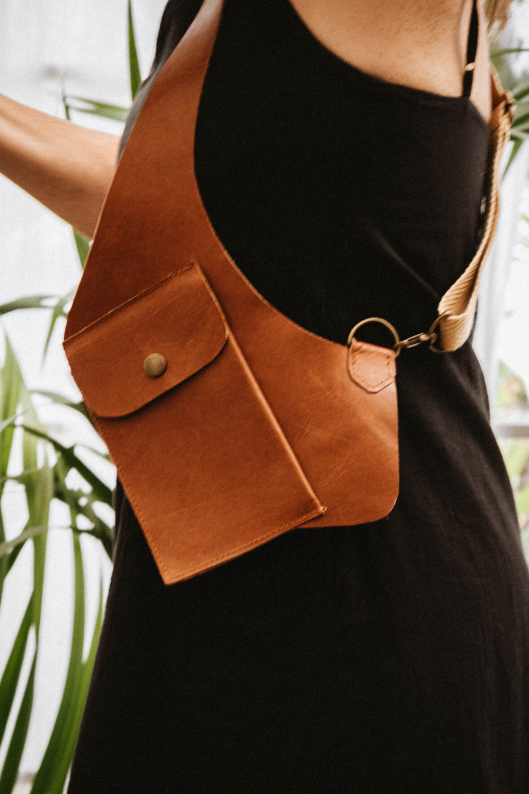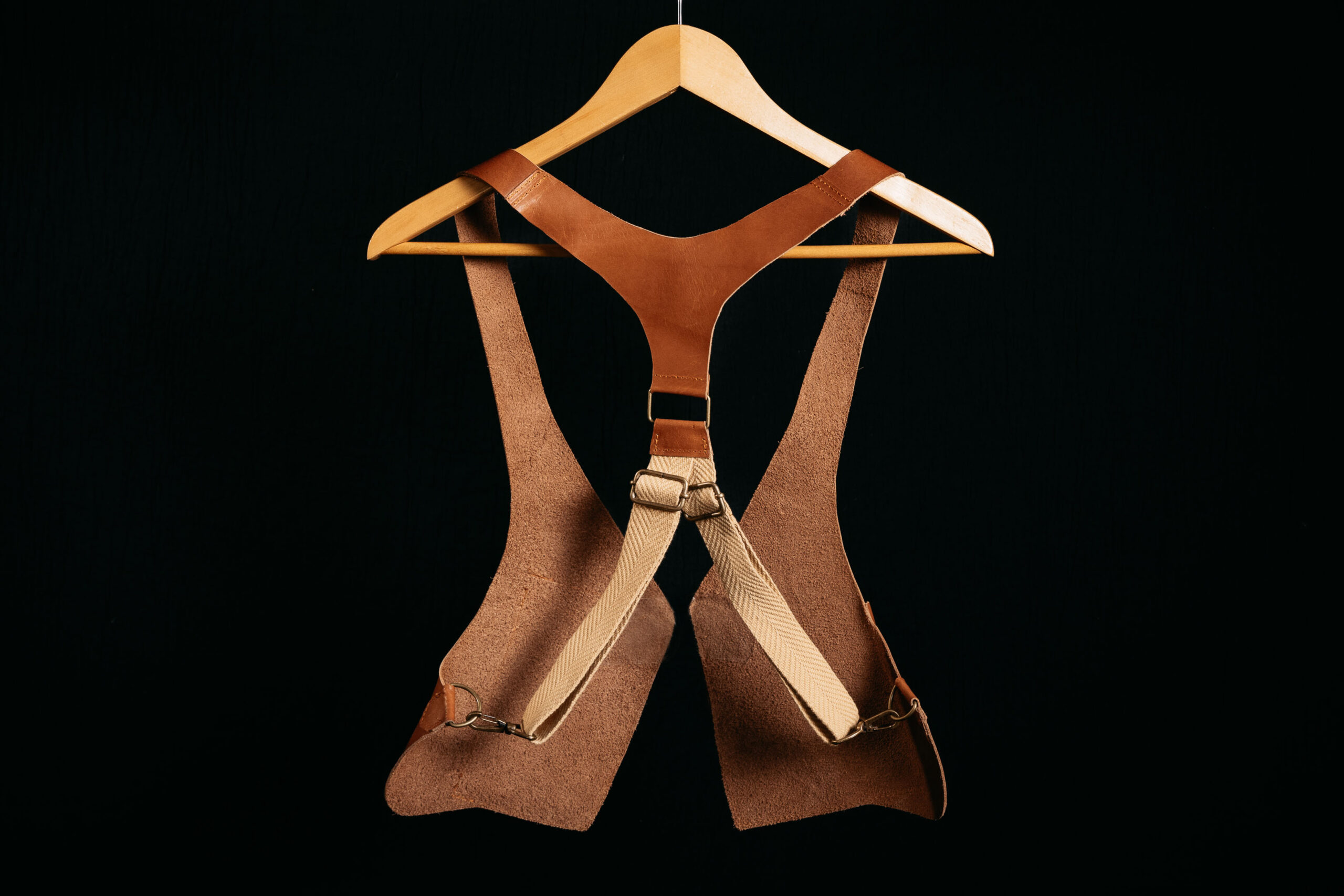 Arnés de cuero, con espalda regulable y bolsillos en su parte delantera.