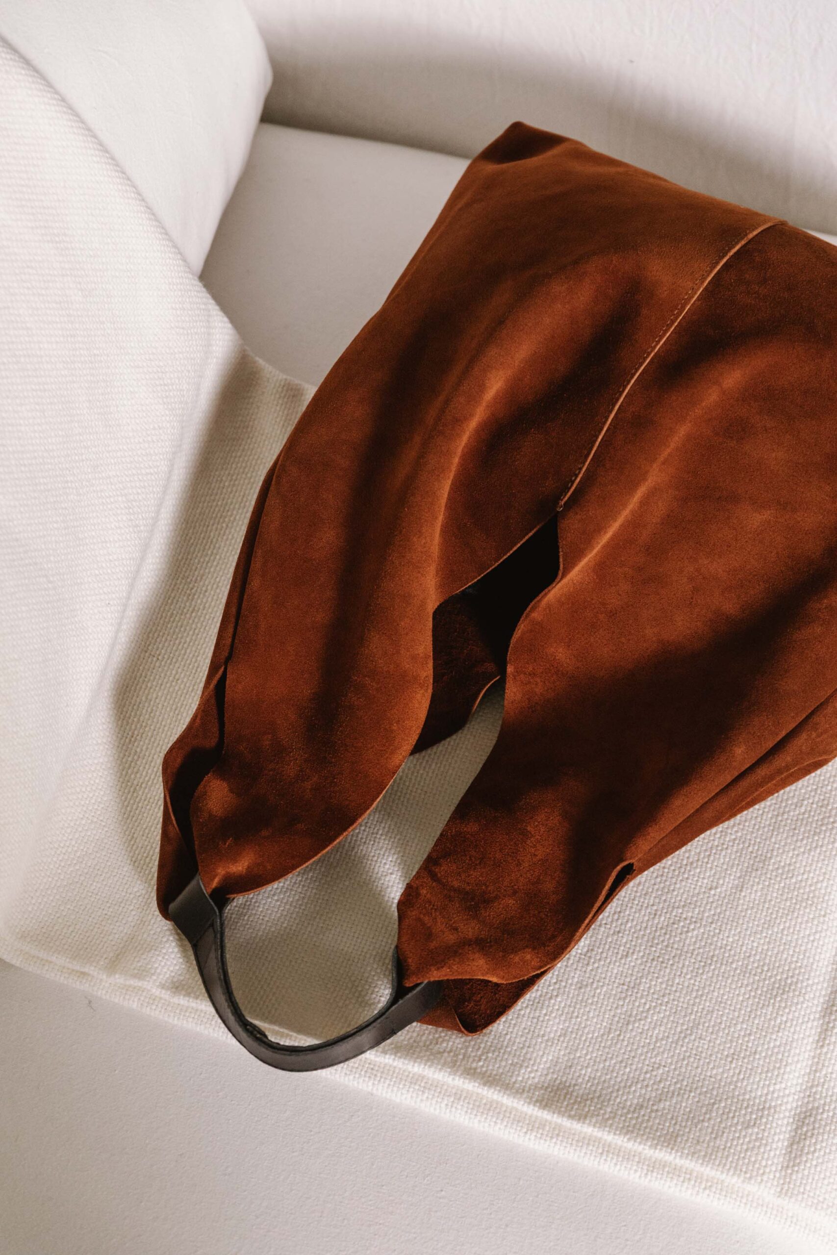 Cartera tipo bolsa de Gamuza, con manija de cuero negro.