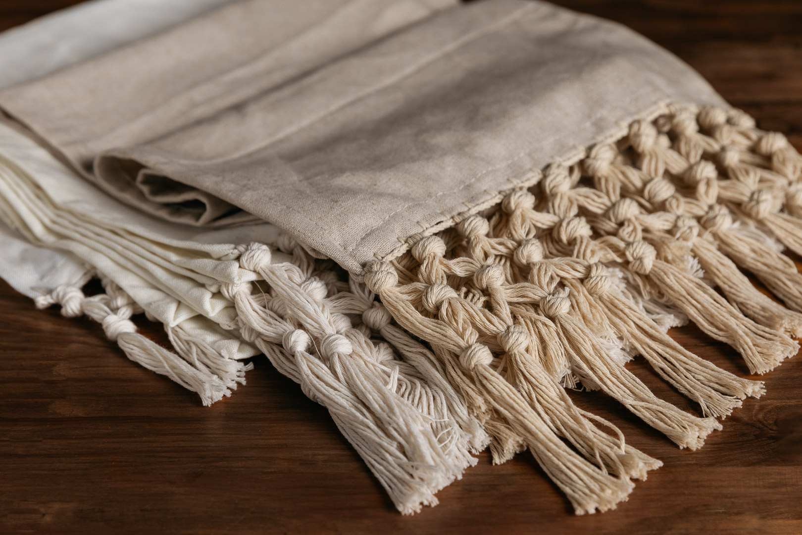 Toalla de mano de Lino Liviano, con pompones y flecos tejidos a mano con Hilo de Algodón.