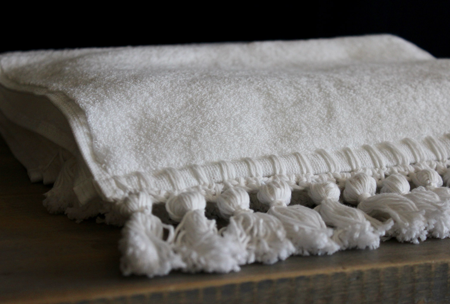 Toalla de mano con detalle perimetral de pompones tejidos en hilo de algodón