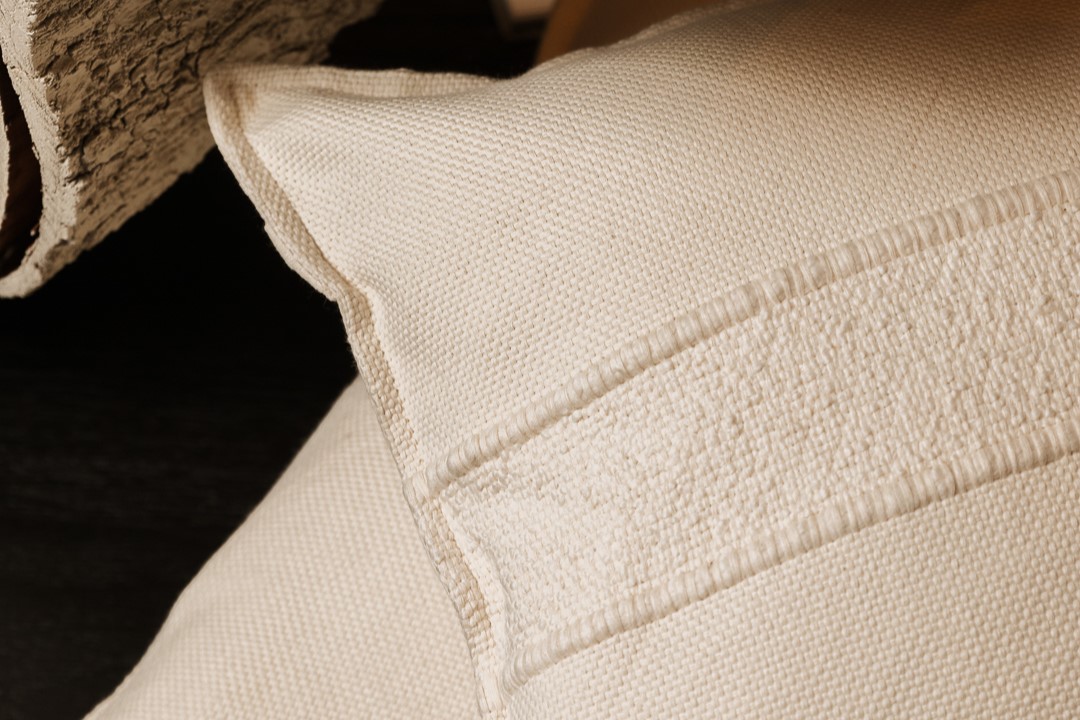 Almohadón de Hilo de Algodón tejido en telar, con trama bouclé en su centro. Espalda de lienzo a tono.