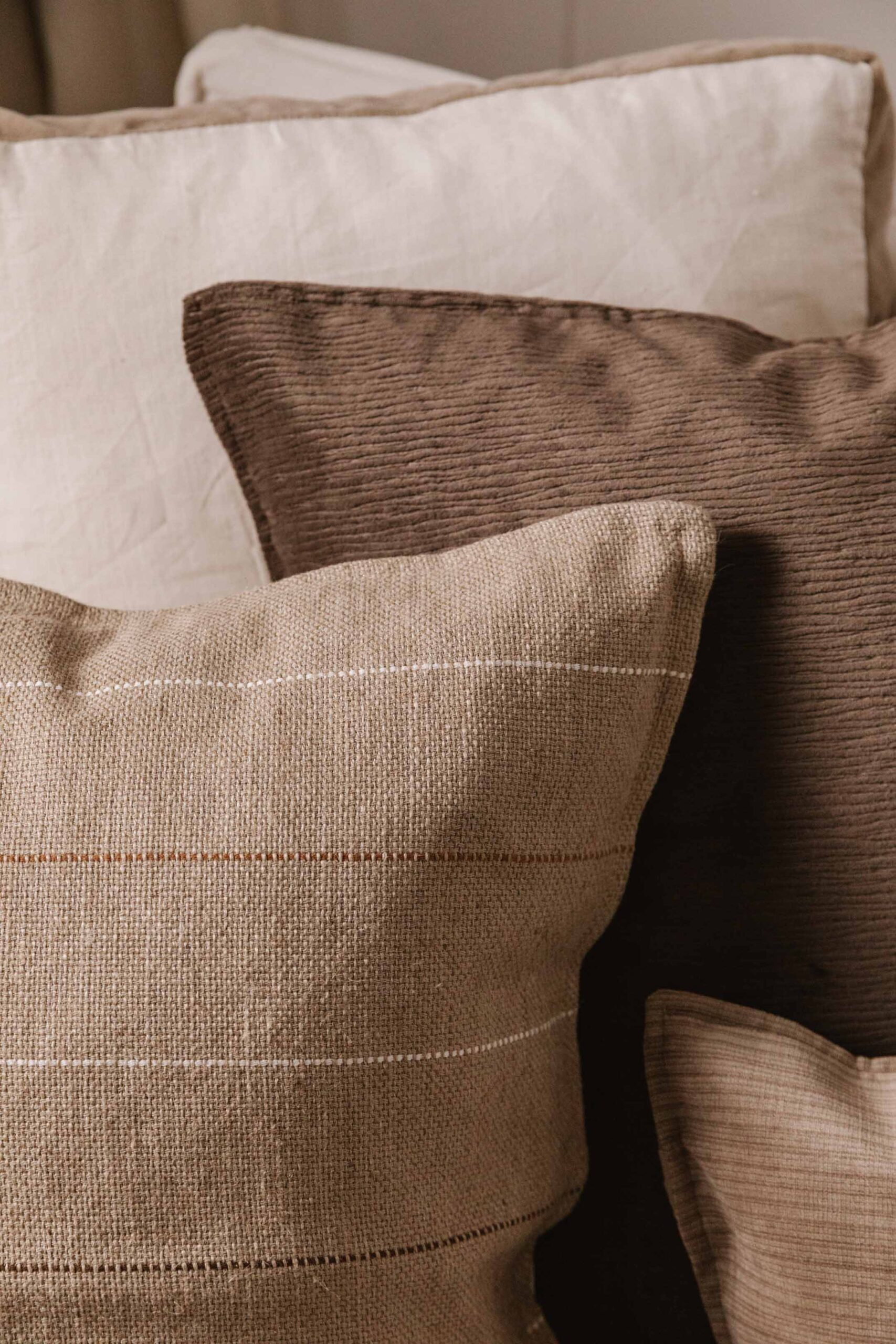 Almohadón con tapa de Hilo de Yute tejido en telar, con franjas color crudo, dulce de leche y chocolate.