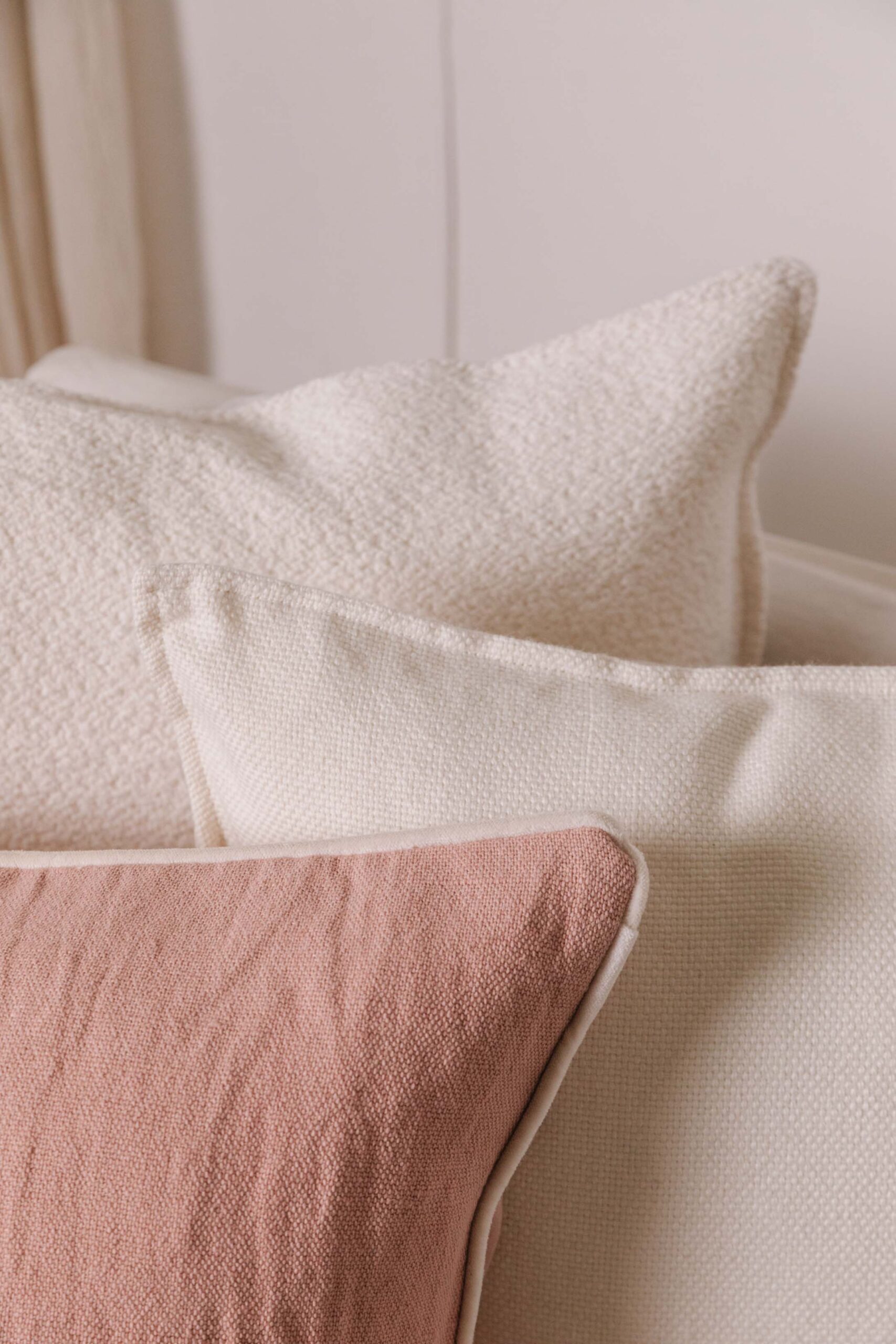 Almohadón confeccionado con tapa en lino rústico color rosa, espalda de terciopelo rosa y borde perimetral en terciopelo crudo