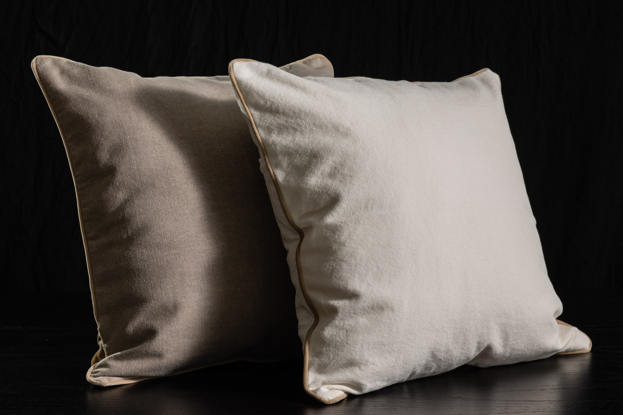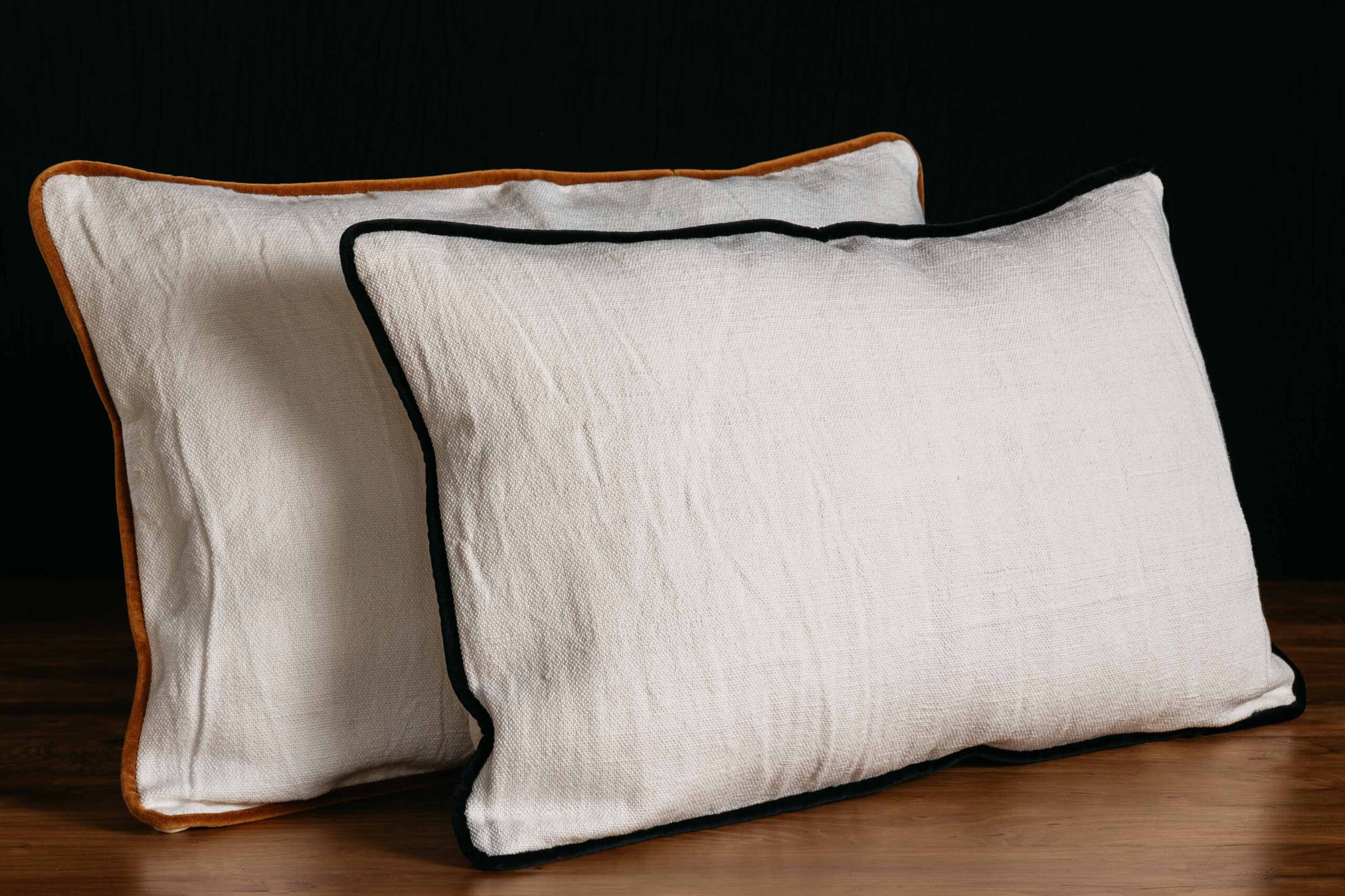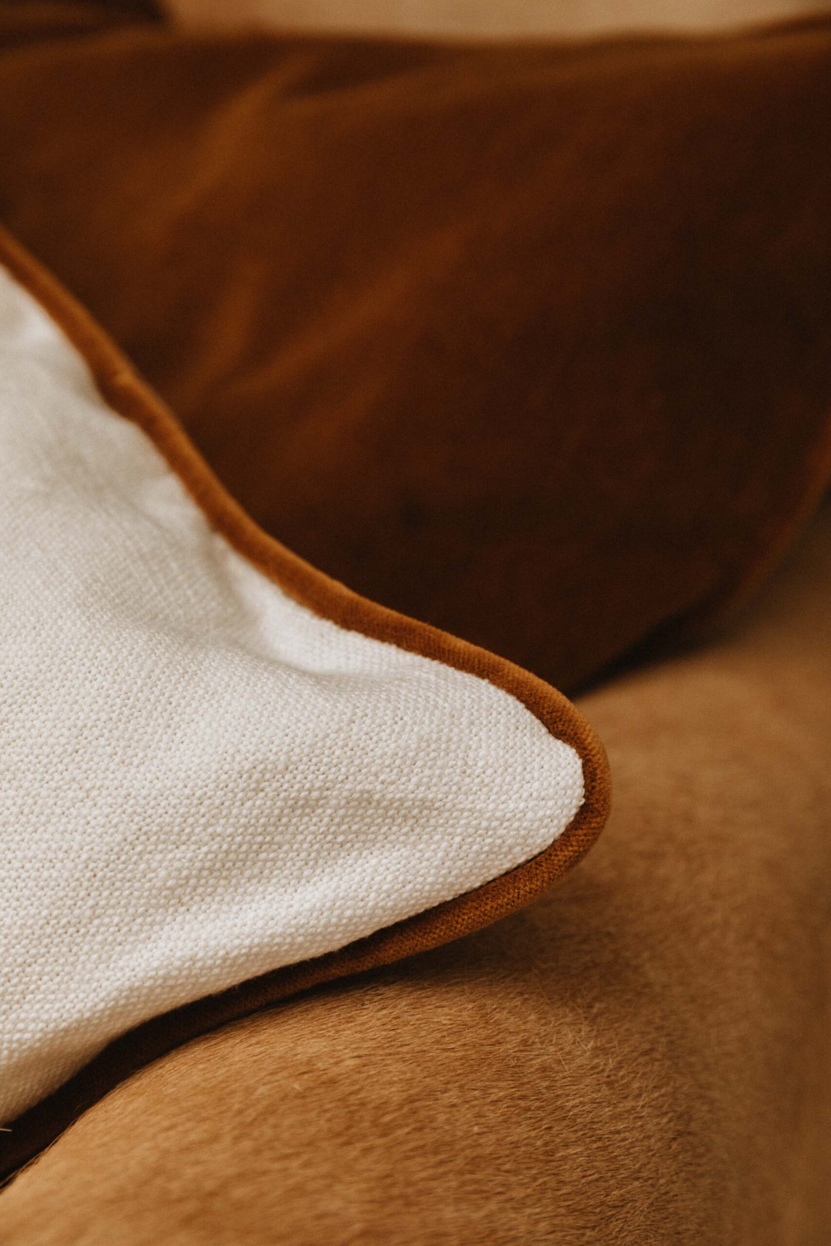 Almohadón confeccionado con tapa en lino rústico, el borde perimetral en terciopelo. Espalda de lienzo a tono.