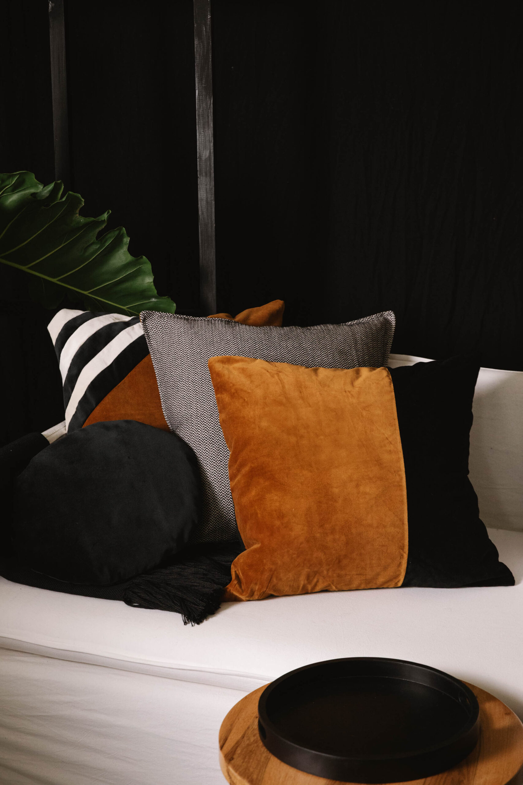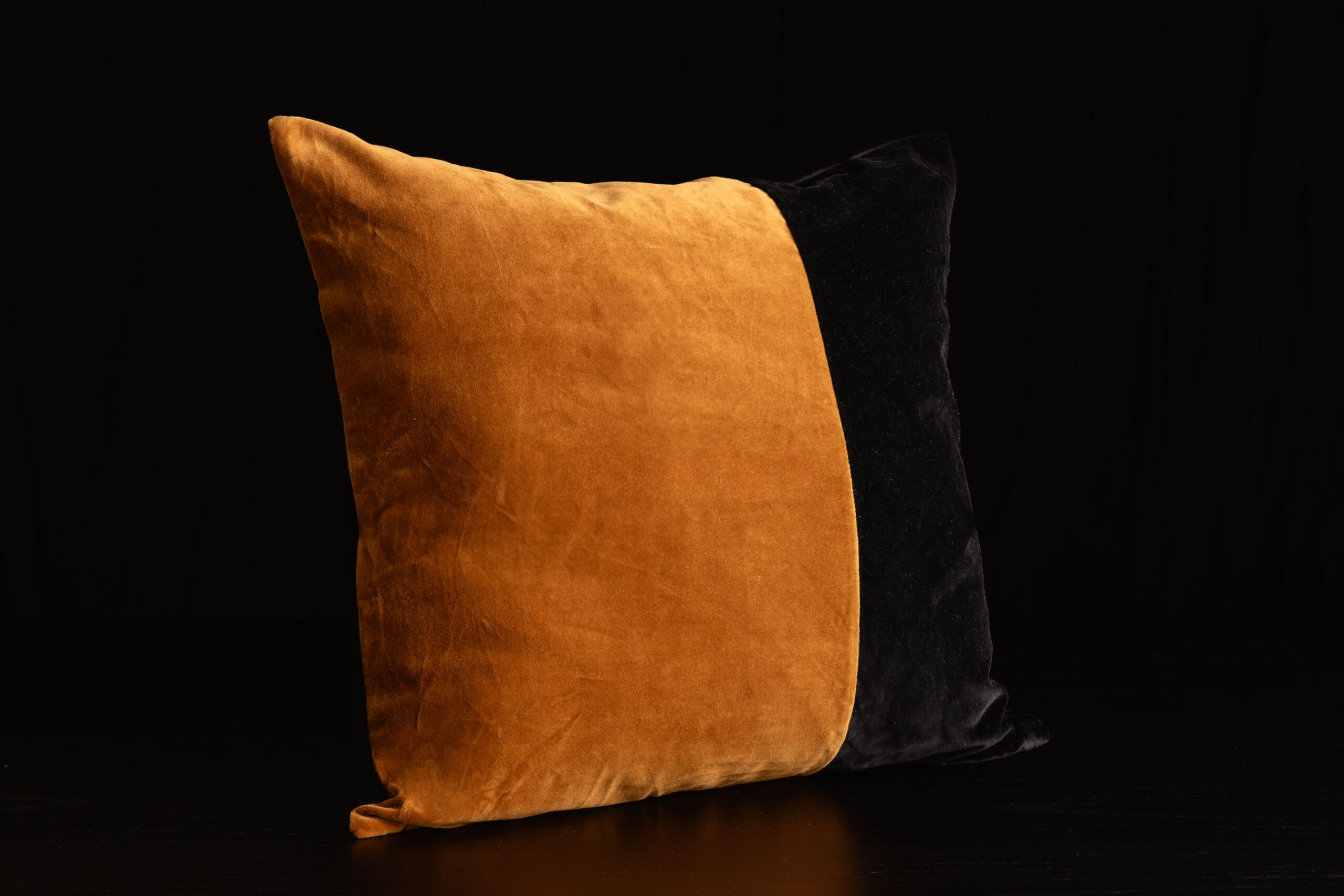 Almohadón Dúo, con tapa de Terciopelo combinando color Negro y Óxido. Espalda de Lienzo negra.