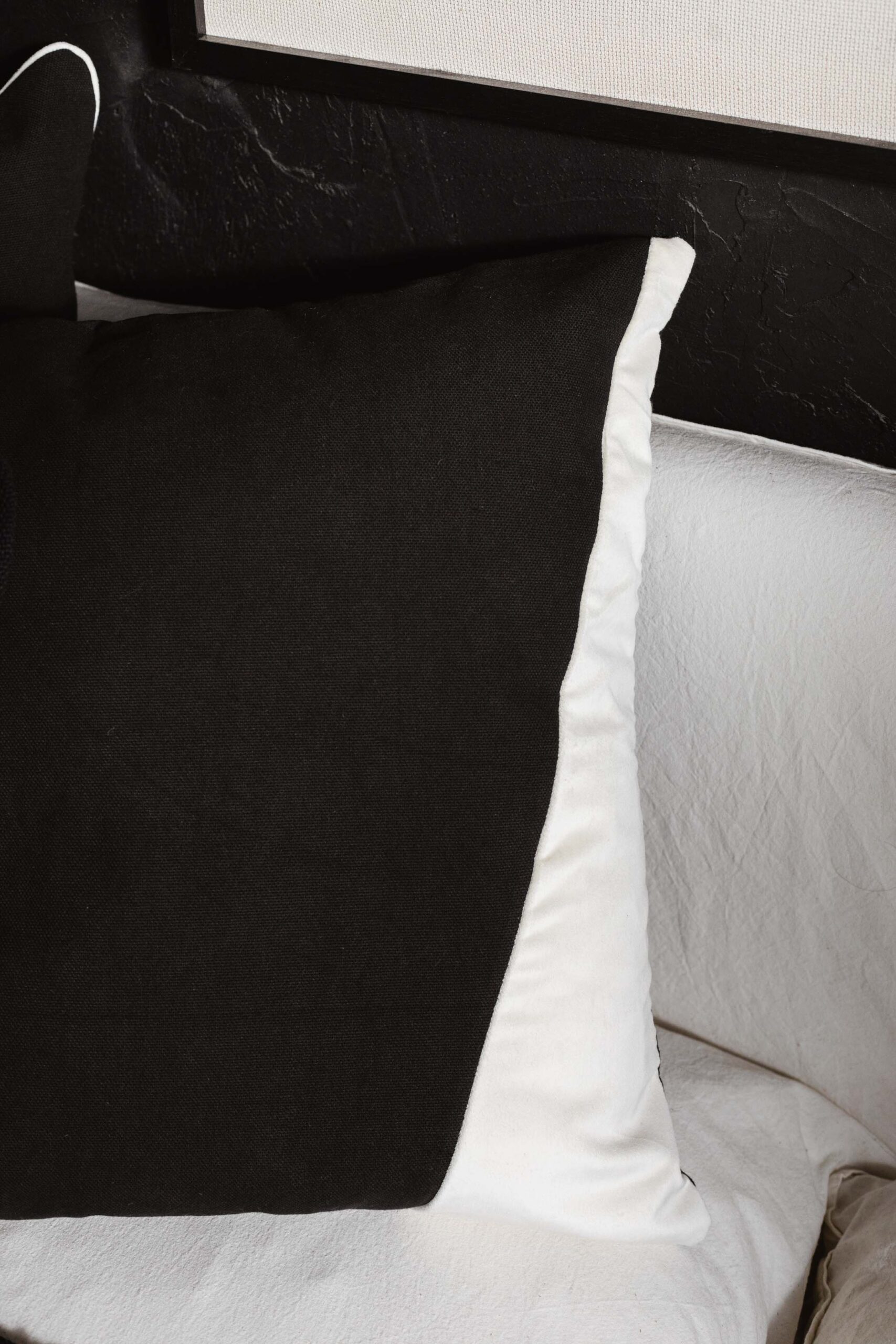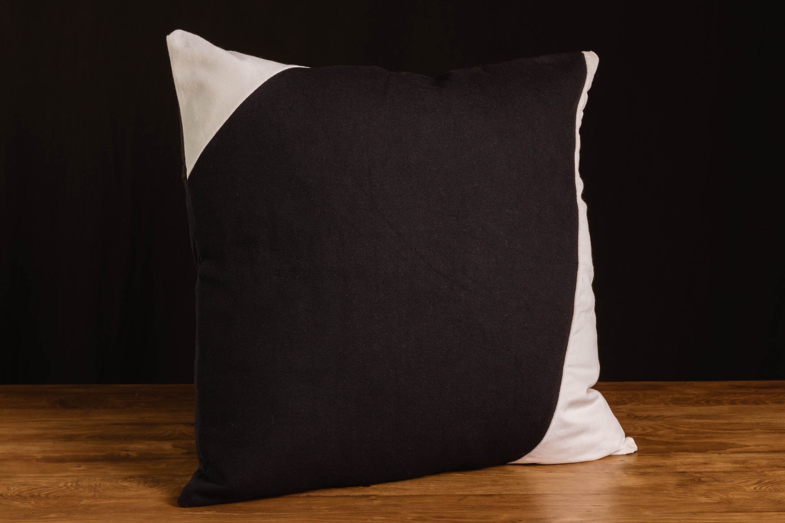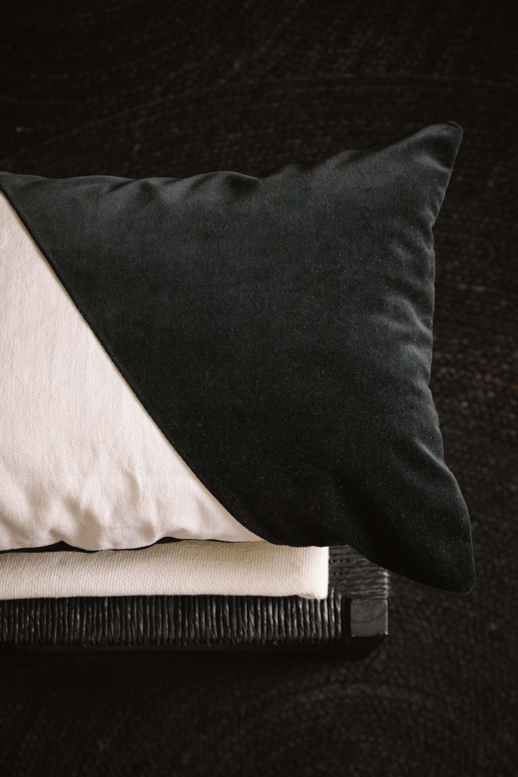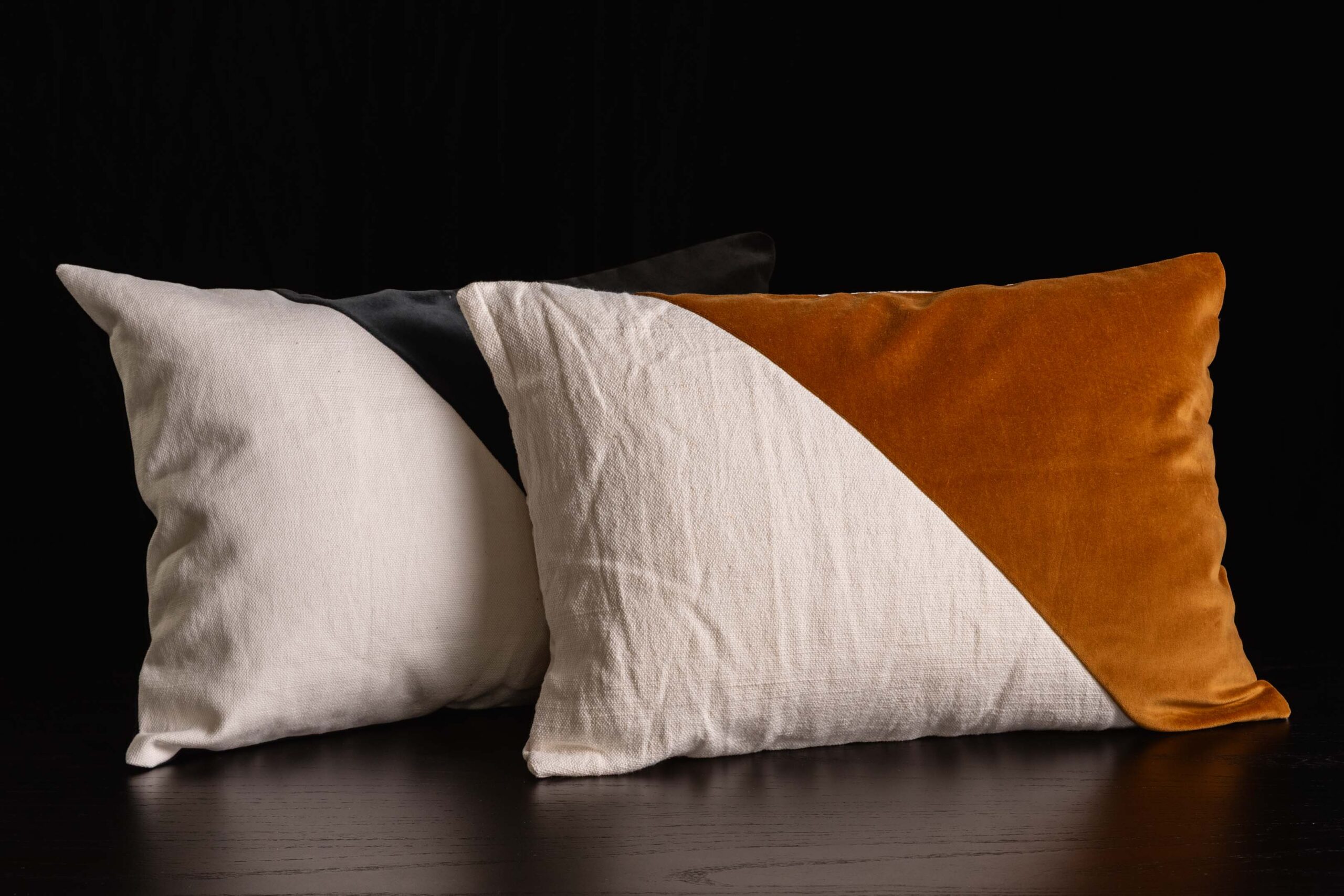 Almohadón confeccionado con una tapa de lino rústico combinado con formas irregulares en terciopelo. Espalda de lienzo a tono.