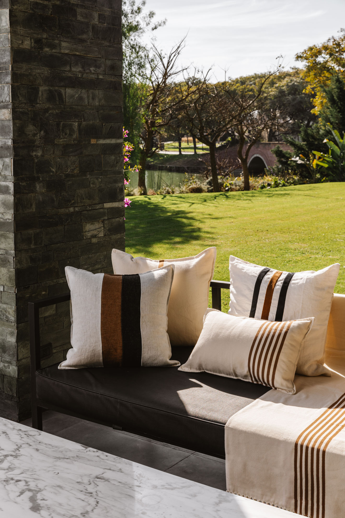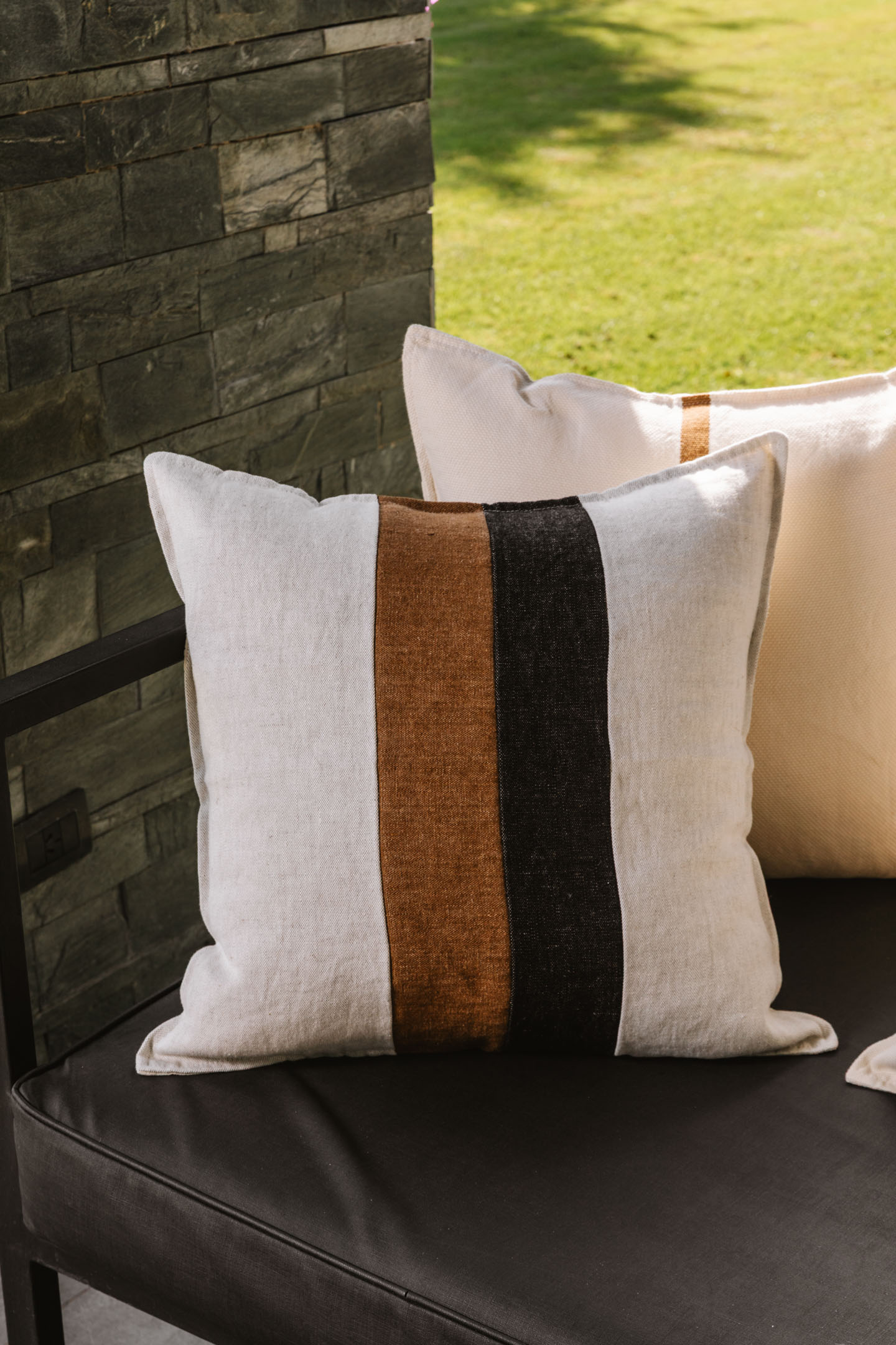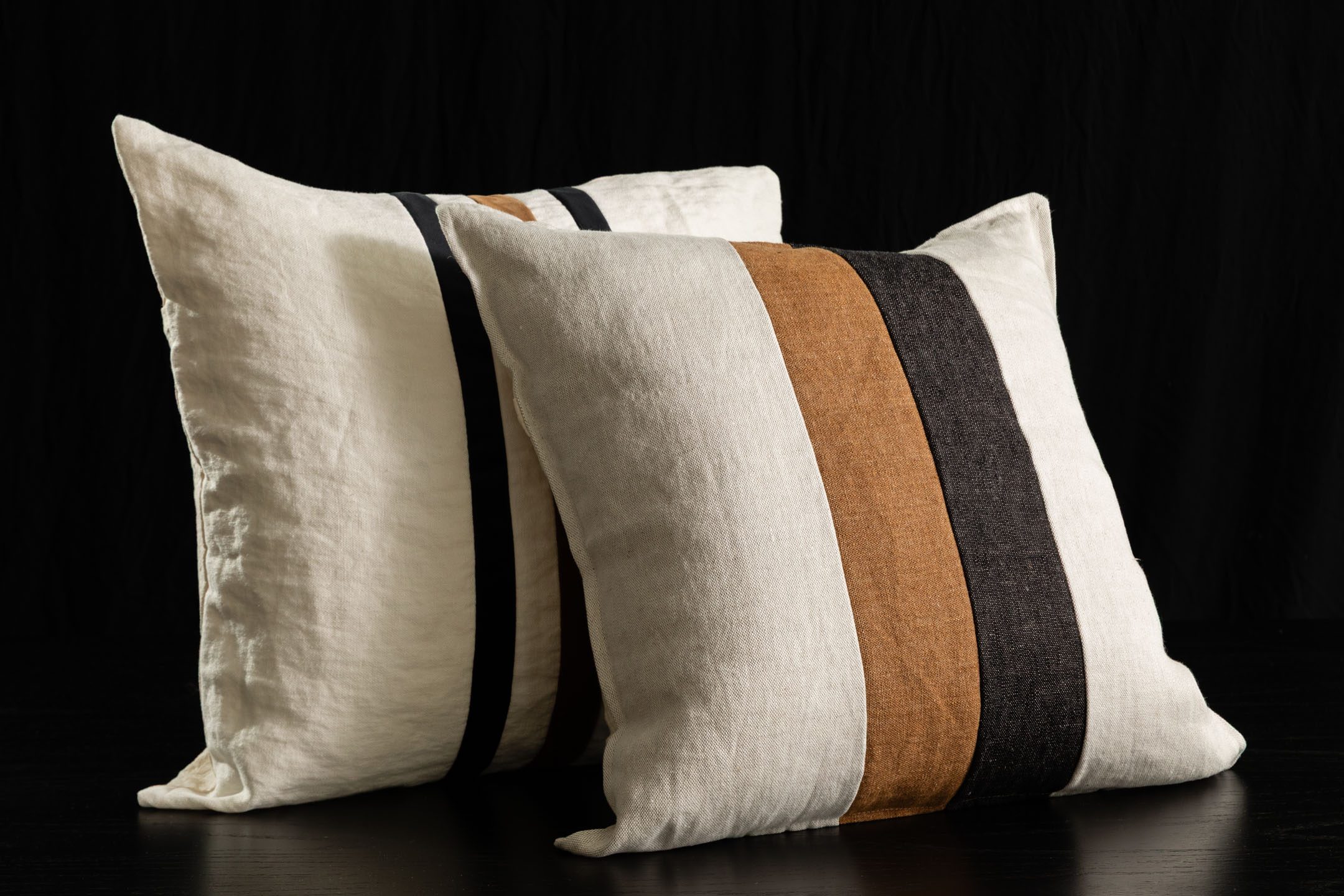 Almohadón de Lino Arpillera con recortes del mismo género. Espalda de lienzo a tono.