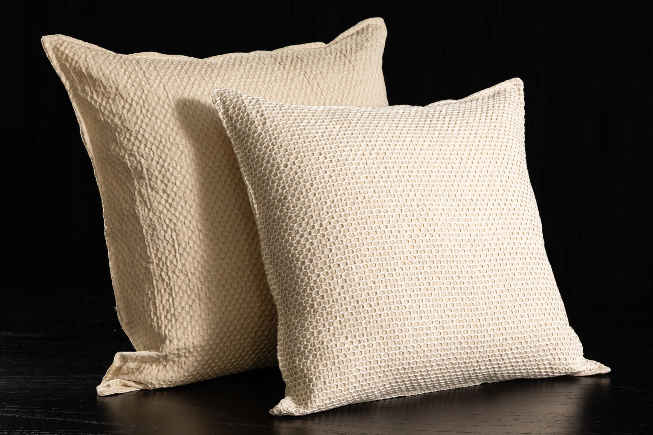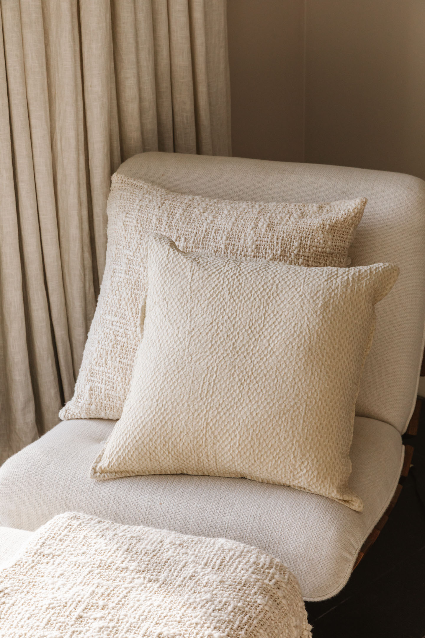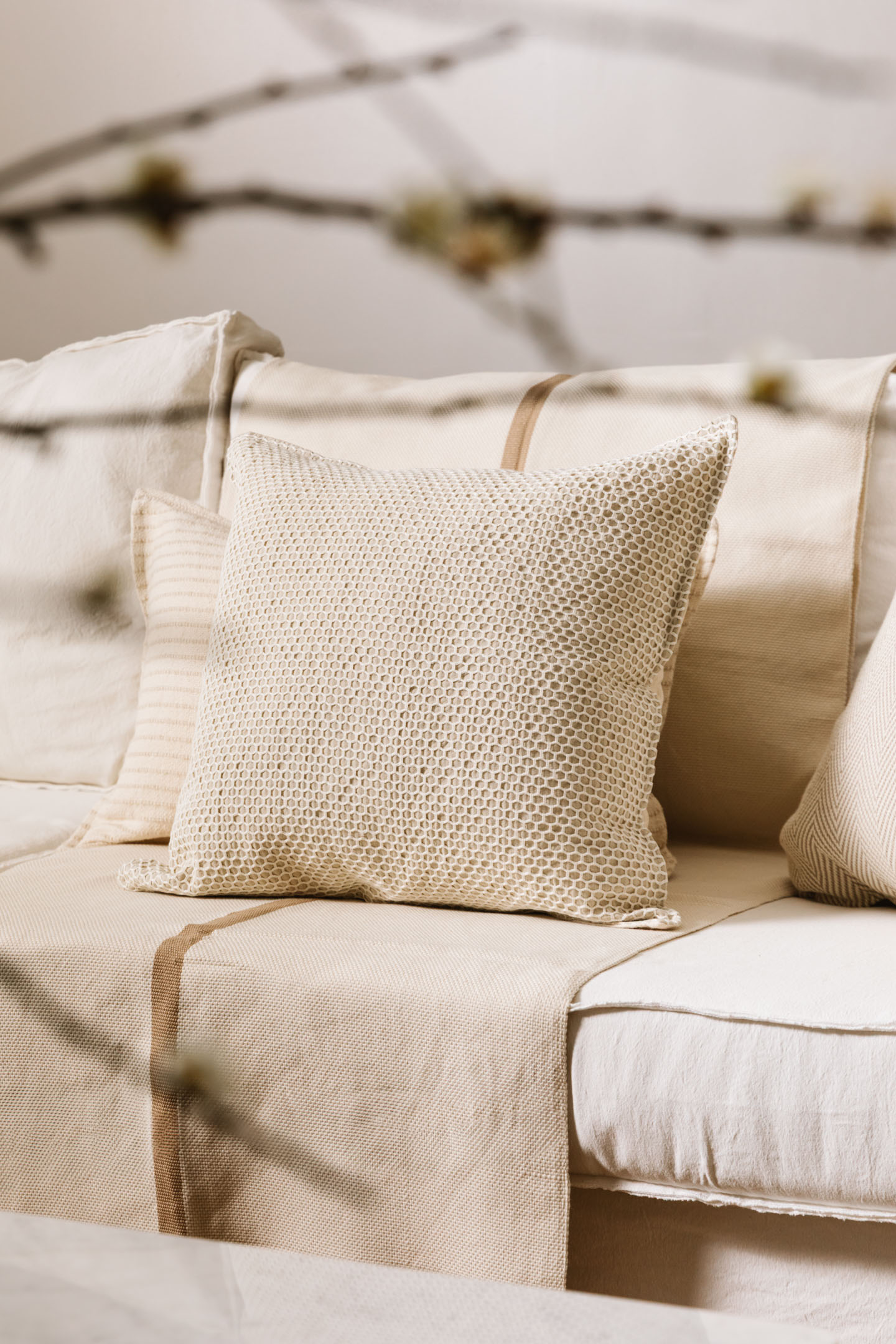 Almohadón con trama tejida en hilo de algodón formando rombos. Espalda de lienzo crudo.