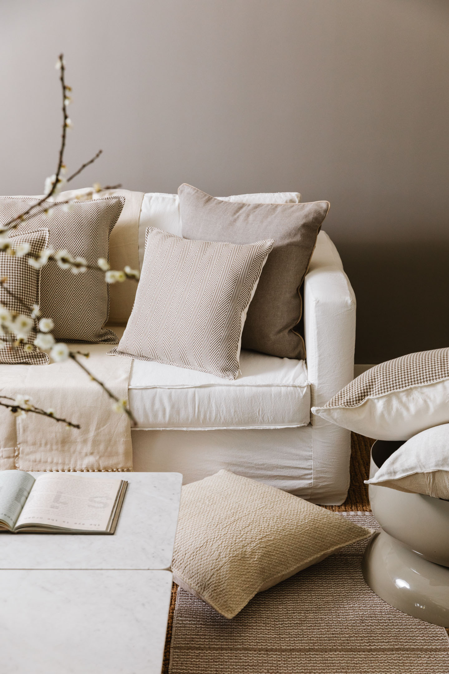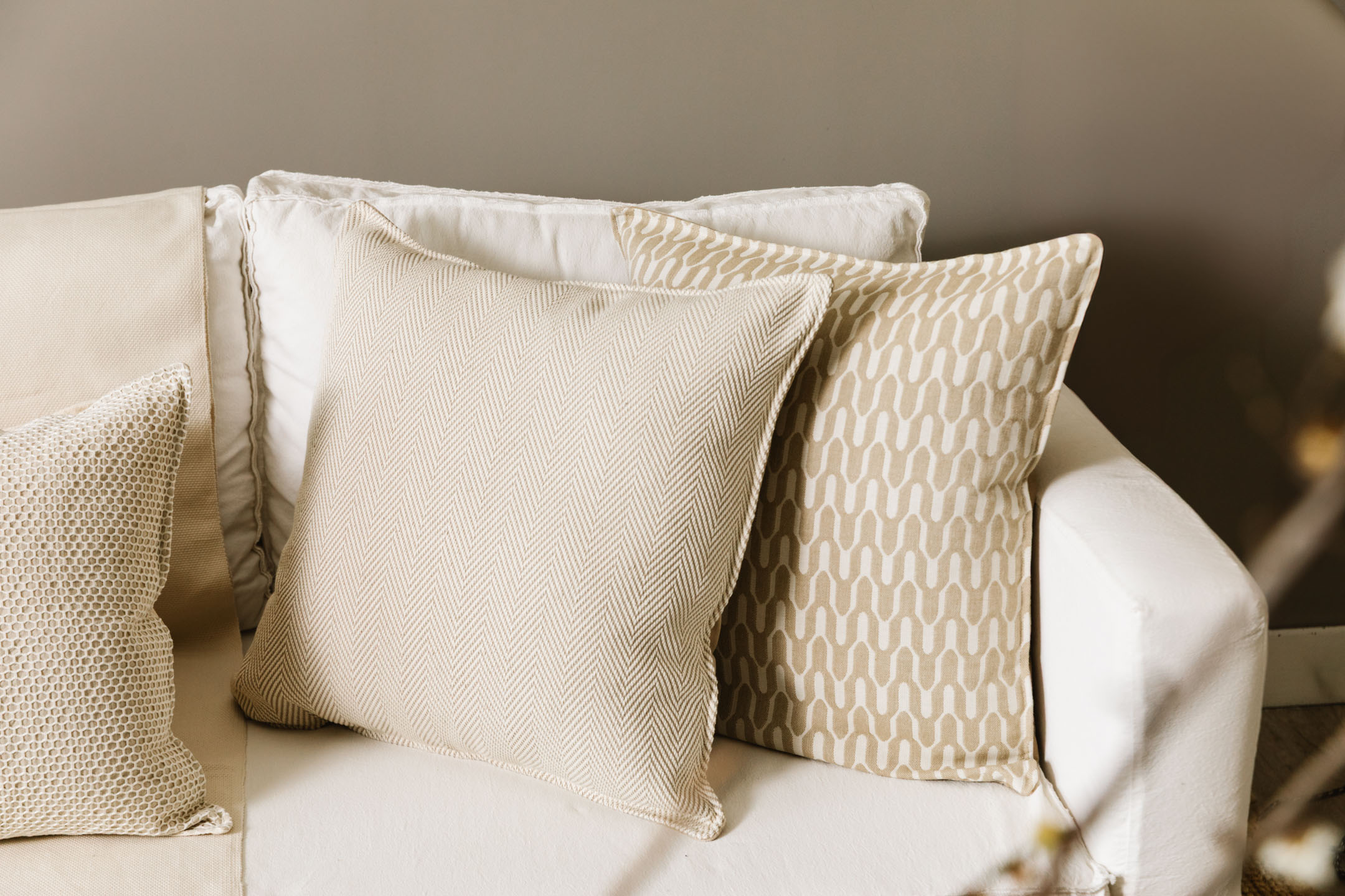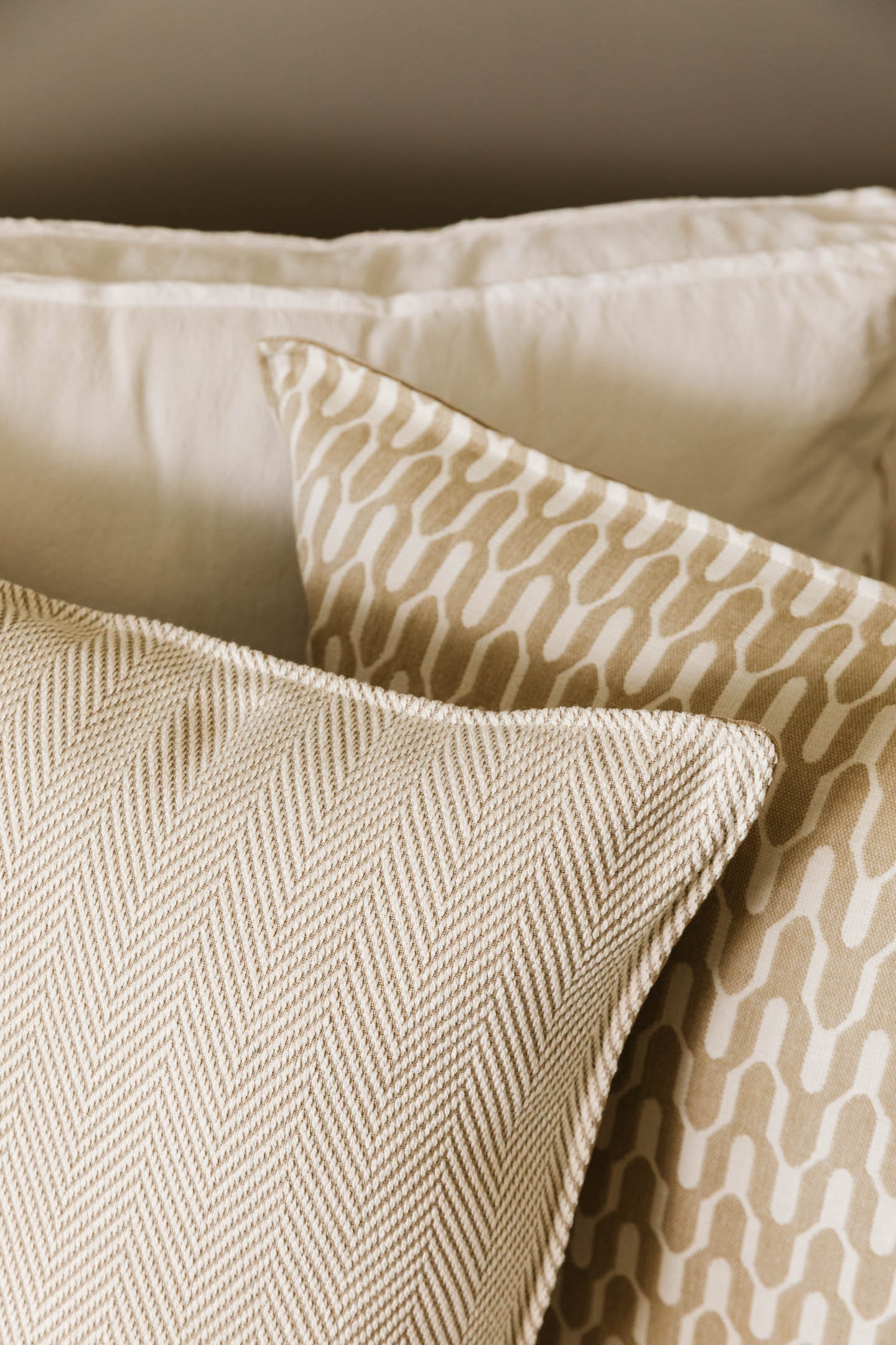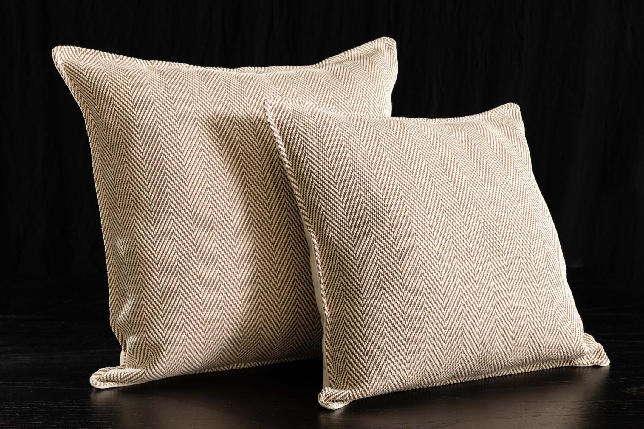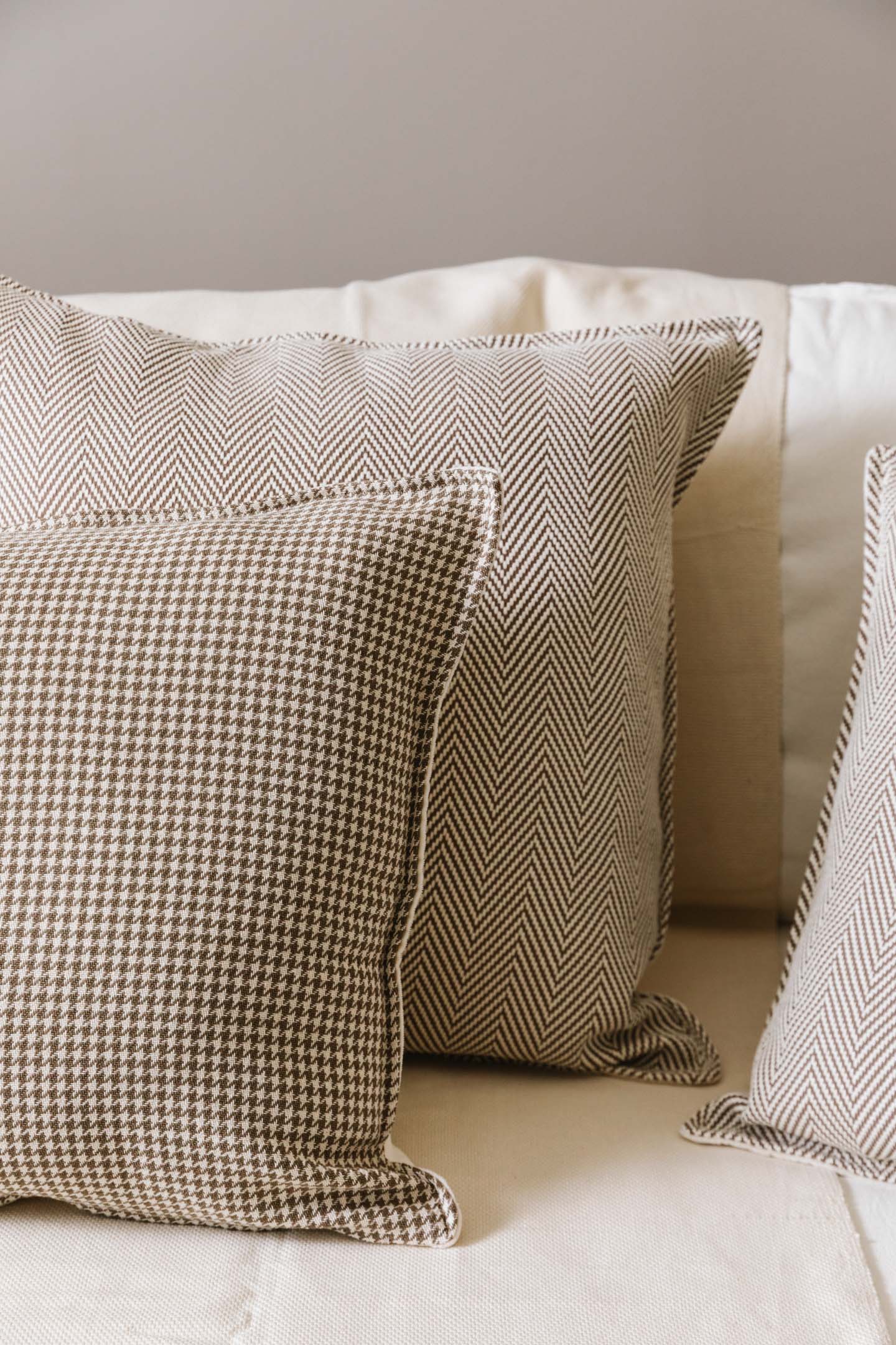 Almohadón Tejido con trama Zig Zag, su espalda es de terciopelo en color crudo.