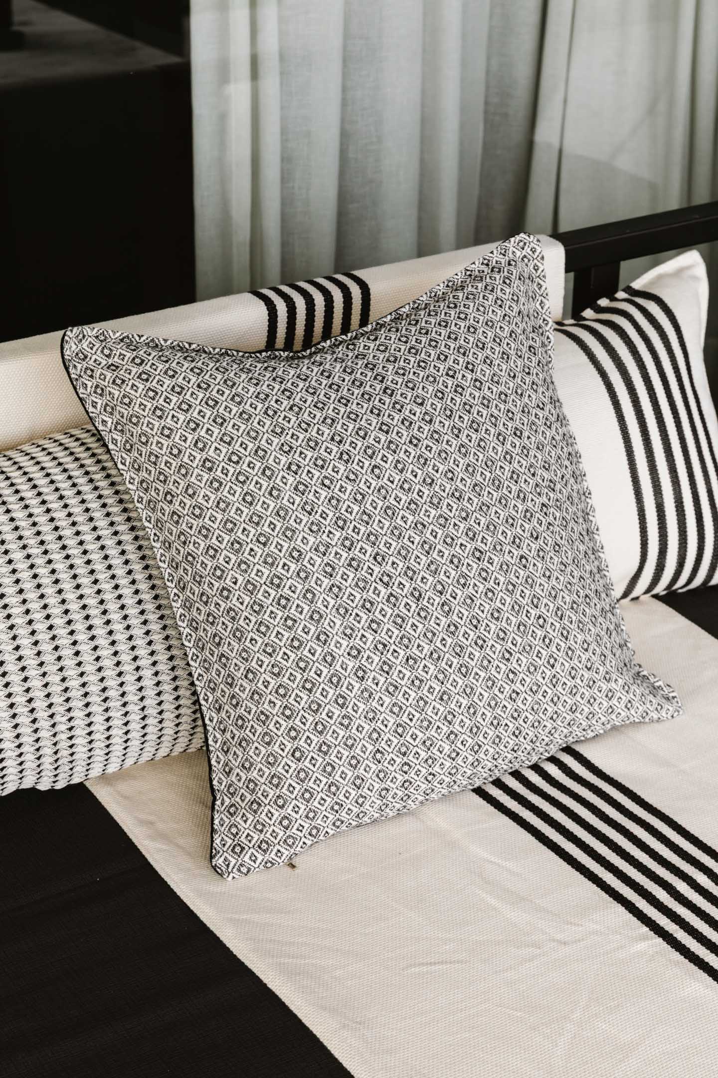 Almohadón de hilo de algodón tejido en telar con seis rayas. Espalda de lienzo a tono.