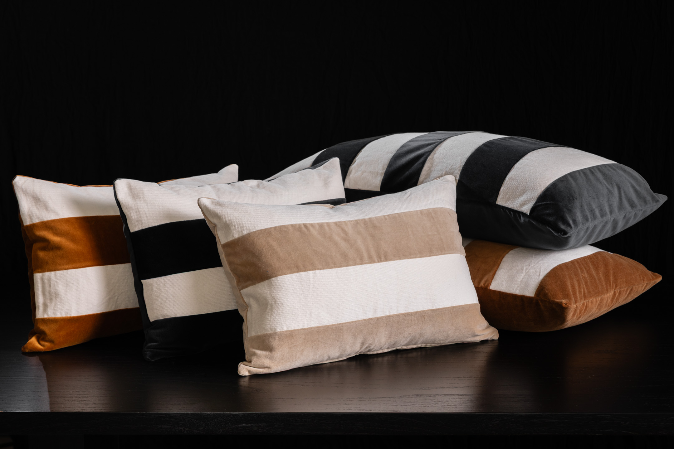 Almohadón con franjas de Lino color crudo y Terciopelo en distintas combinaciones.