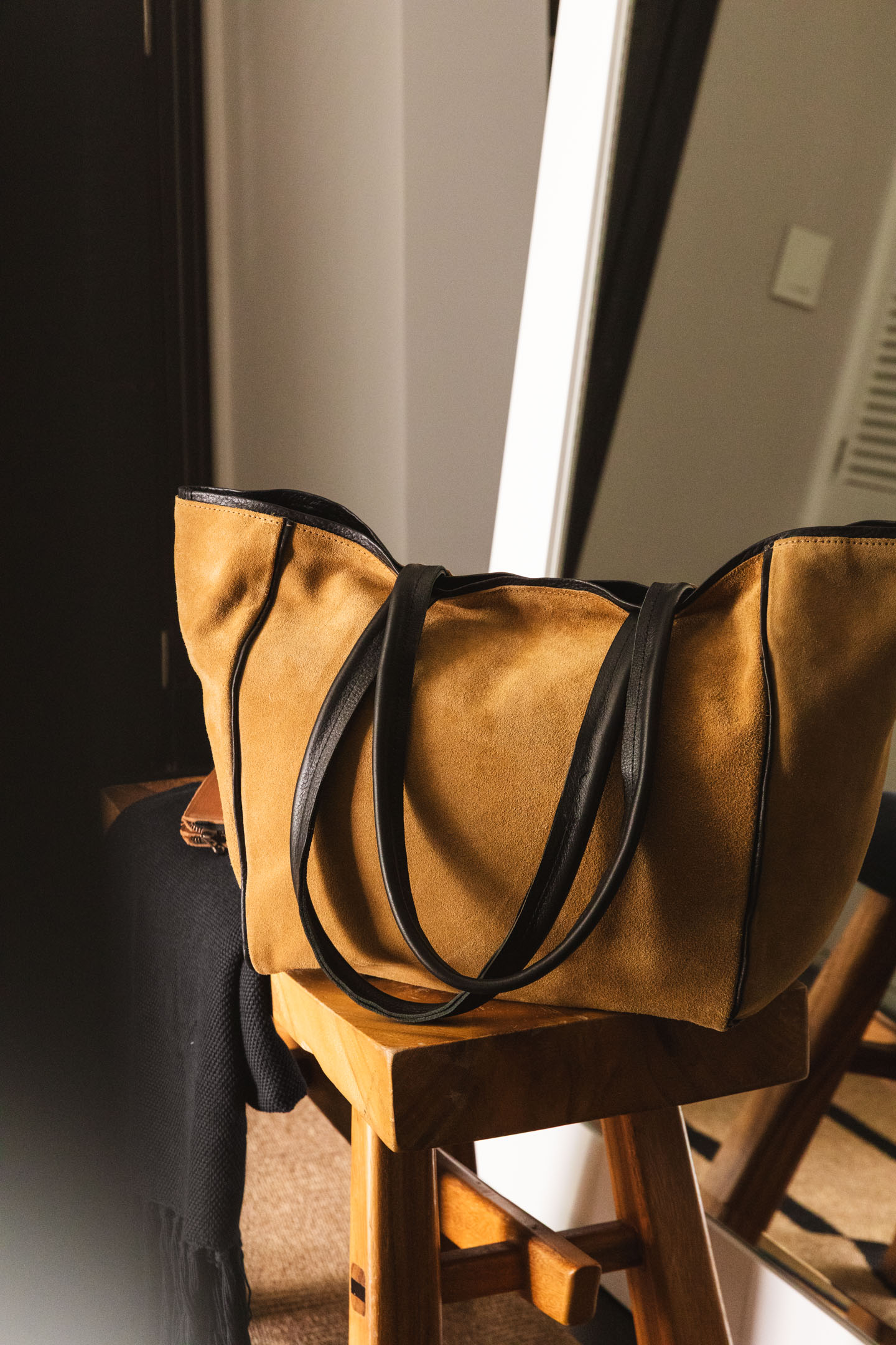 Cartera de gamuza con vivos de cuero negro. Forrería interna de rayas crudo y negro. Con broche imantado.