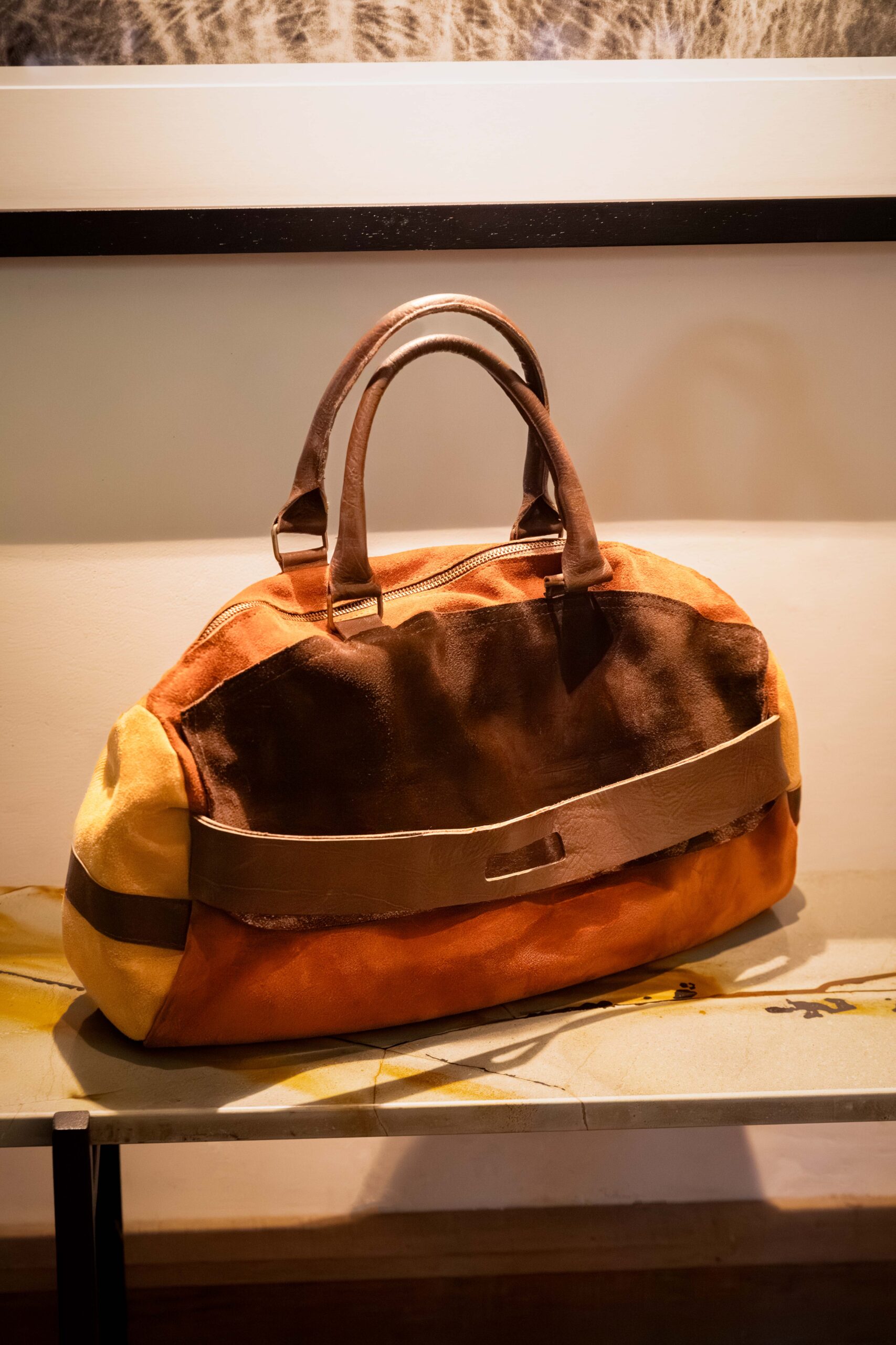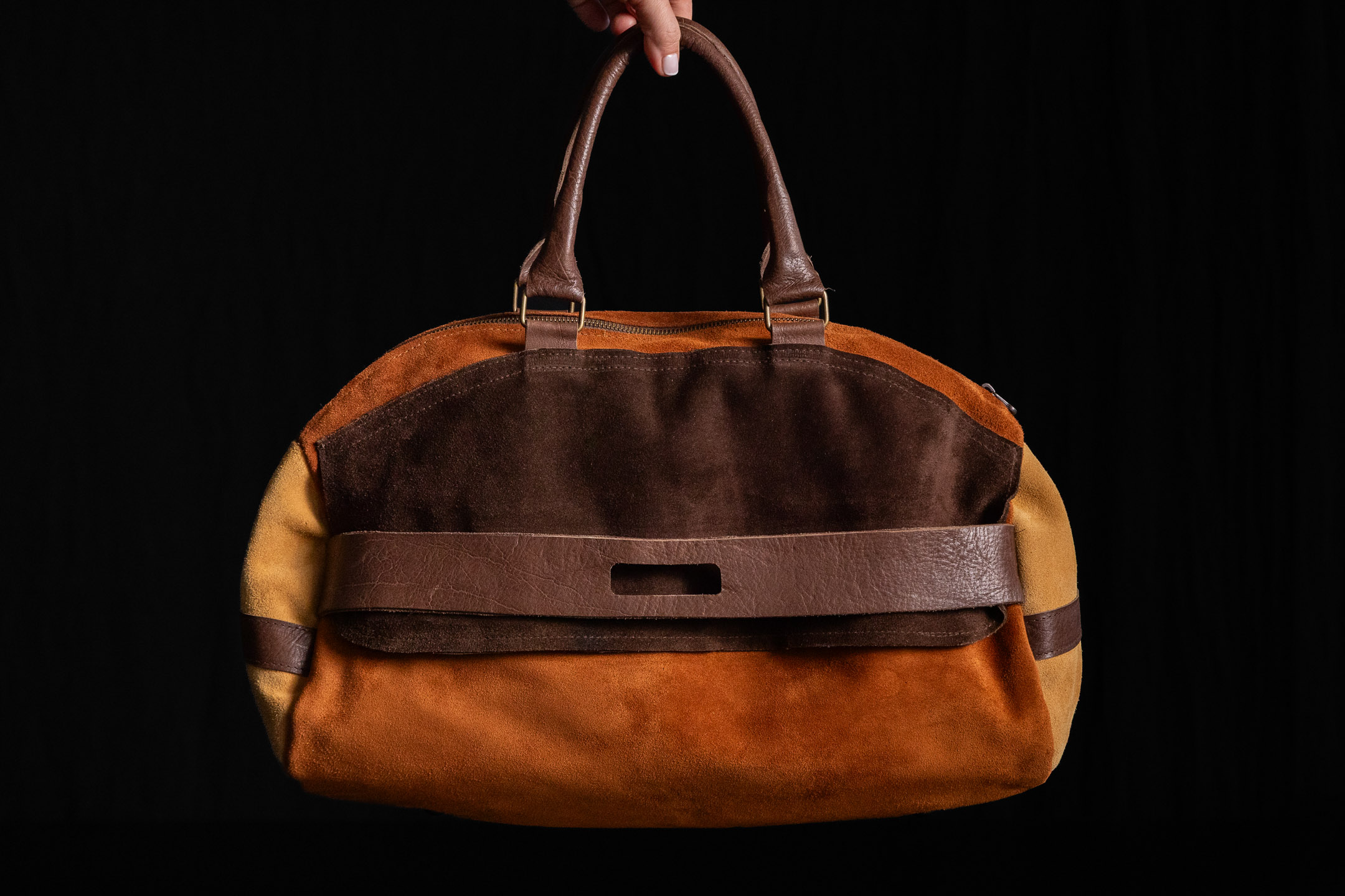 Cartera de gamuza combinada en color chocolate, caramelo y beige. Detalles de cuero en color marrón. Posee un bolsillo delantero.